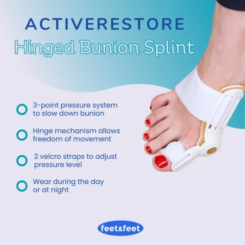 The ActiveRestore Hinged Bunion Splint is designed to straighten a bunion – also known as hallux valgus – and prevent the big toe from overlapping by using a 3-point pressure system that’s intended to slow down the progression of the bunion.