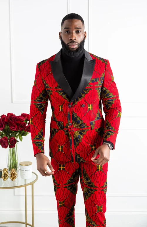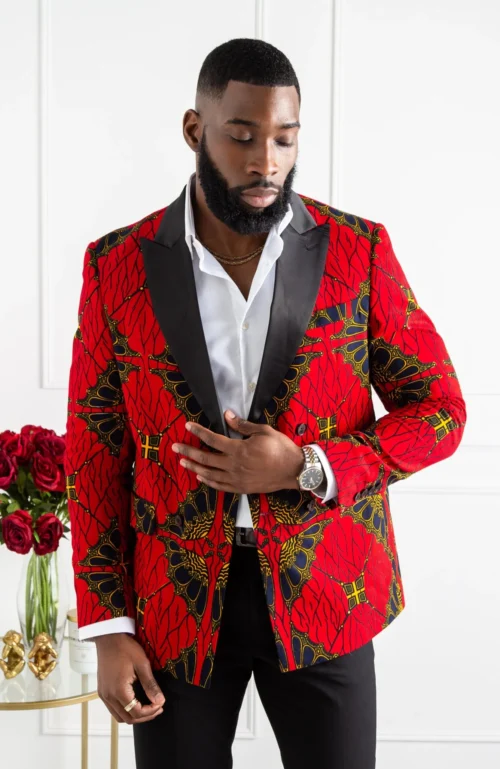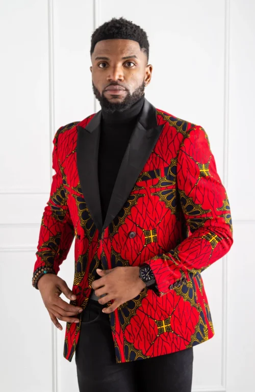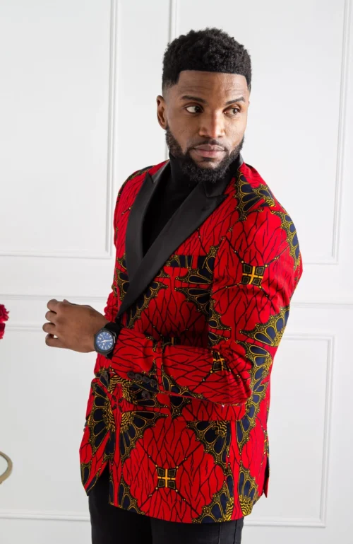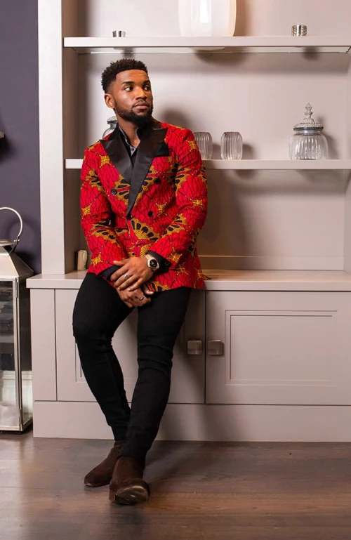 Wear this African print jacket with a black crew neck jumper and rich brown Oxford shoes for a contrasting look that will make a statement that’s right for those special evenings out.