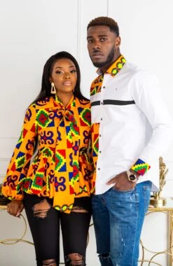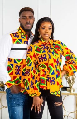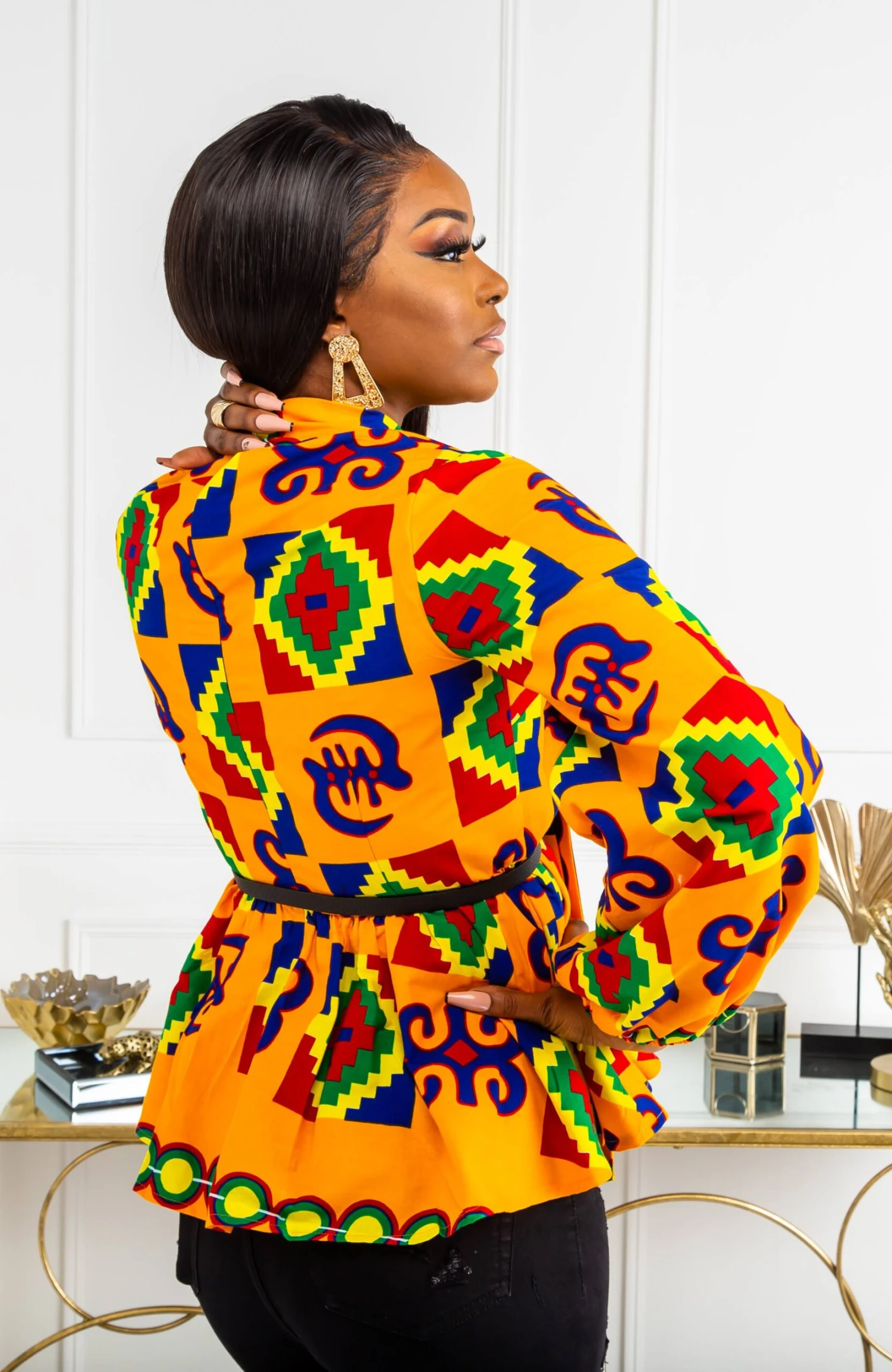 Our African print pussybow peplum blouse is crisply tailored, yet casually chic – our newest must-have. Inspired by the 70’s, our blouse features bell (balloon) sleeves and an ultra feminine neck tie over a frontal zipper.