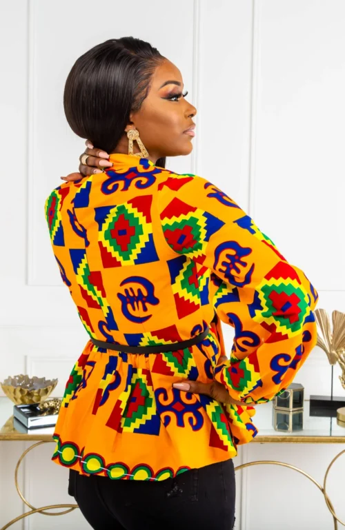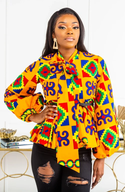 Our African print pussybow peplum blouse is crisply tailored, yet casually chic – our newest must-have. Inspired by the 70’s, our blouse features bell (balloon) sleeves and an ultra feminine neck tie over a frontal zipper.
