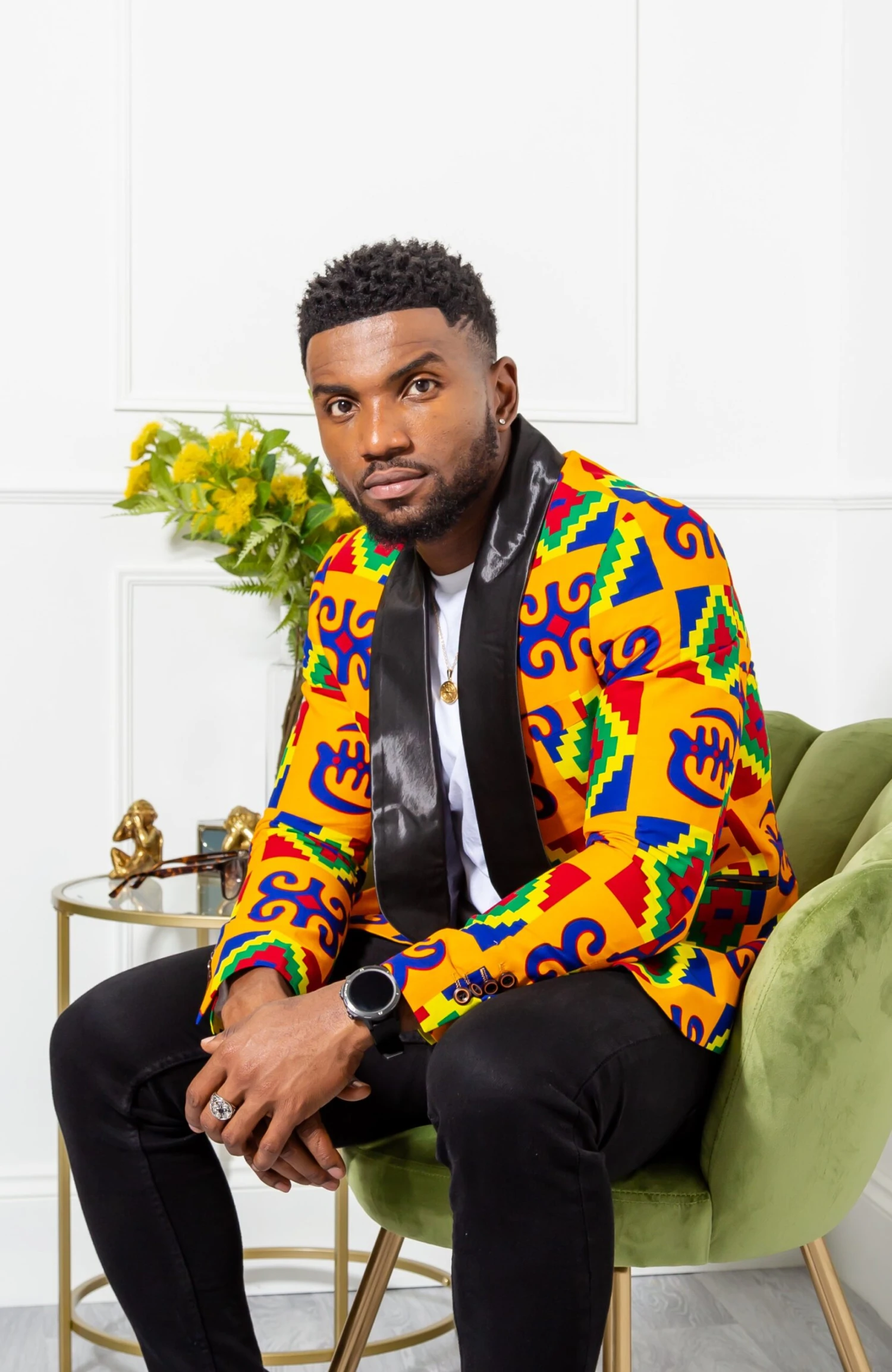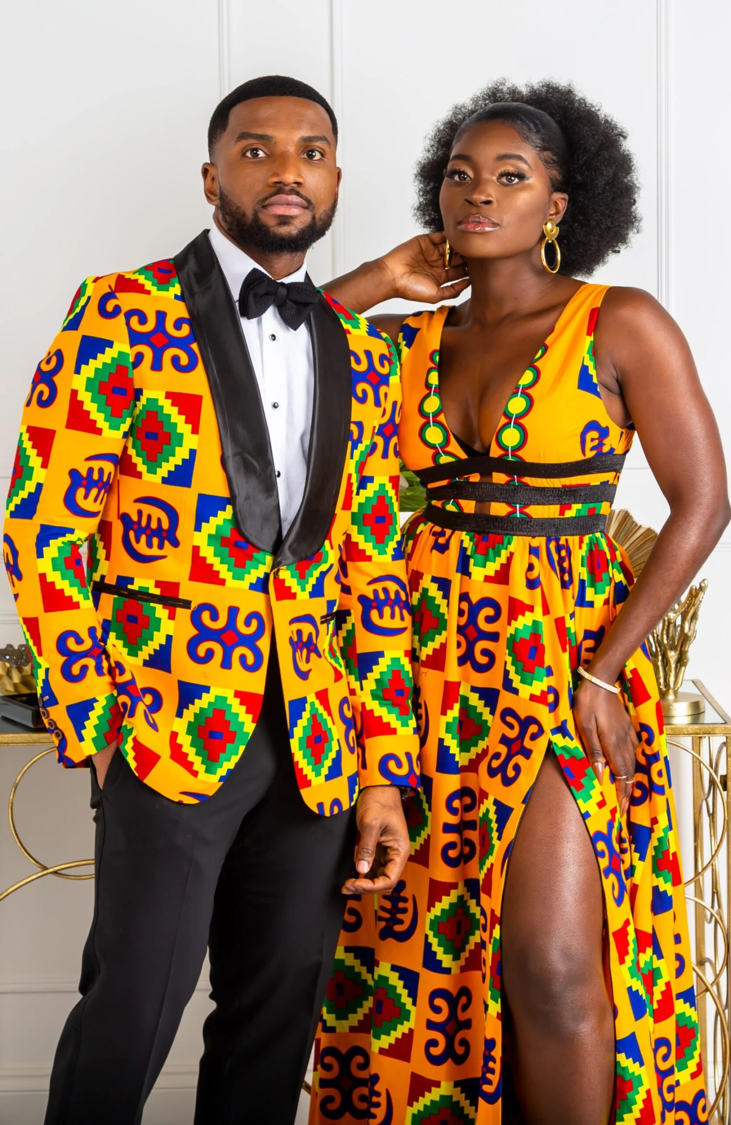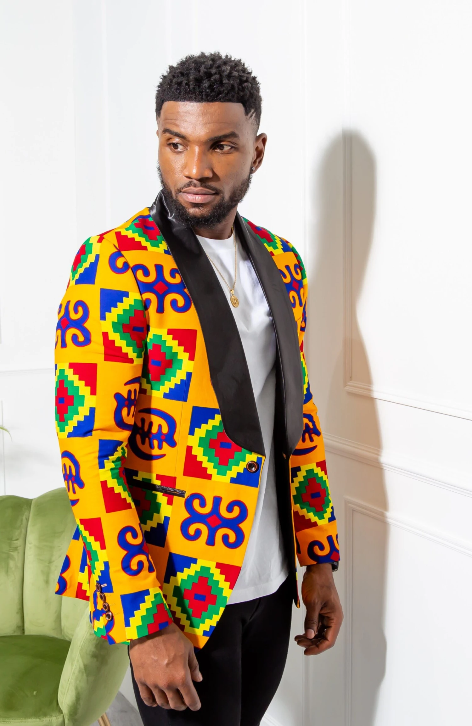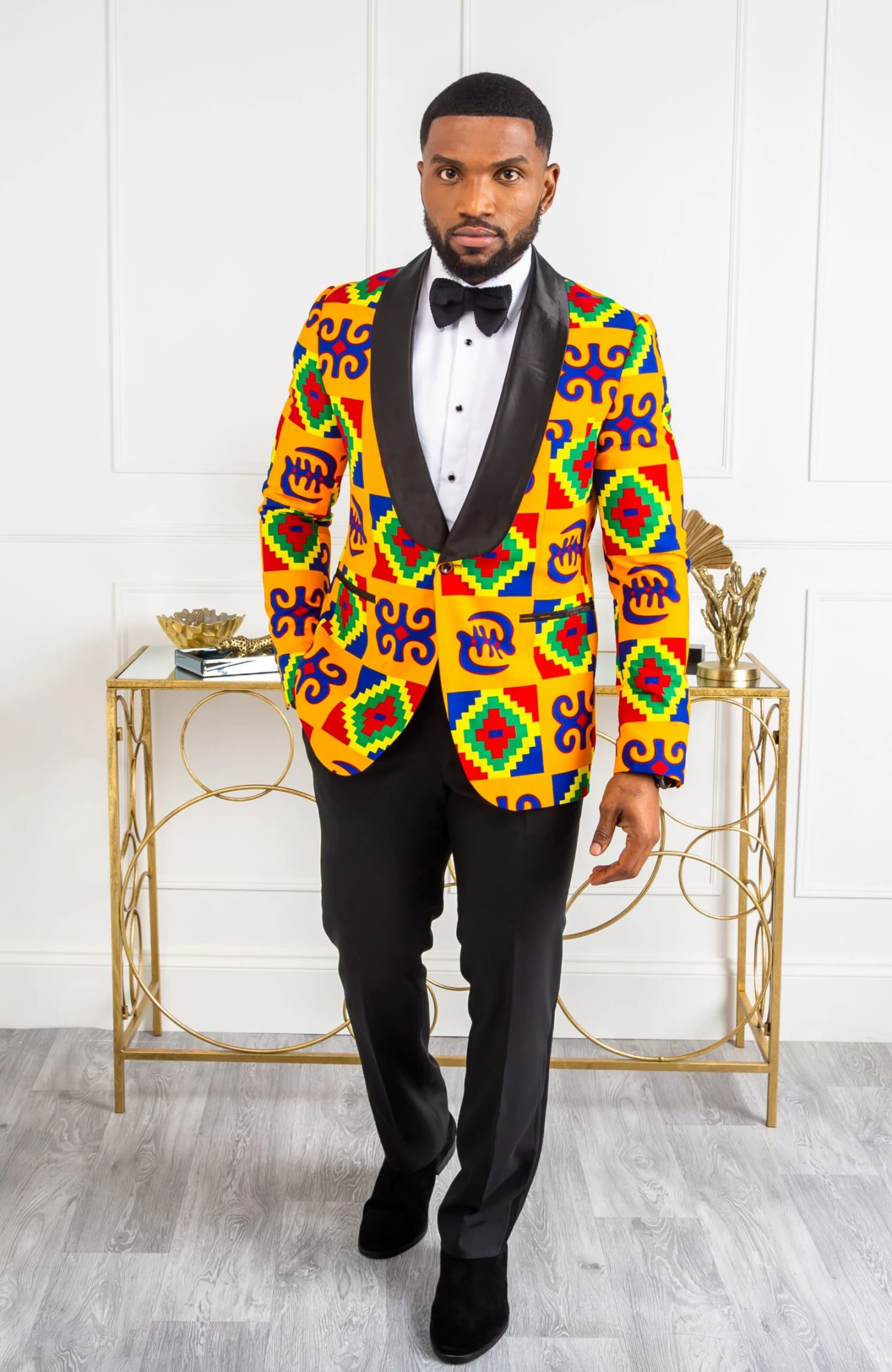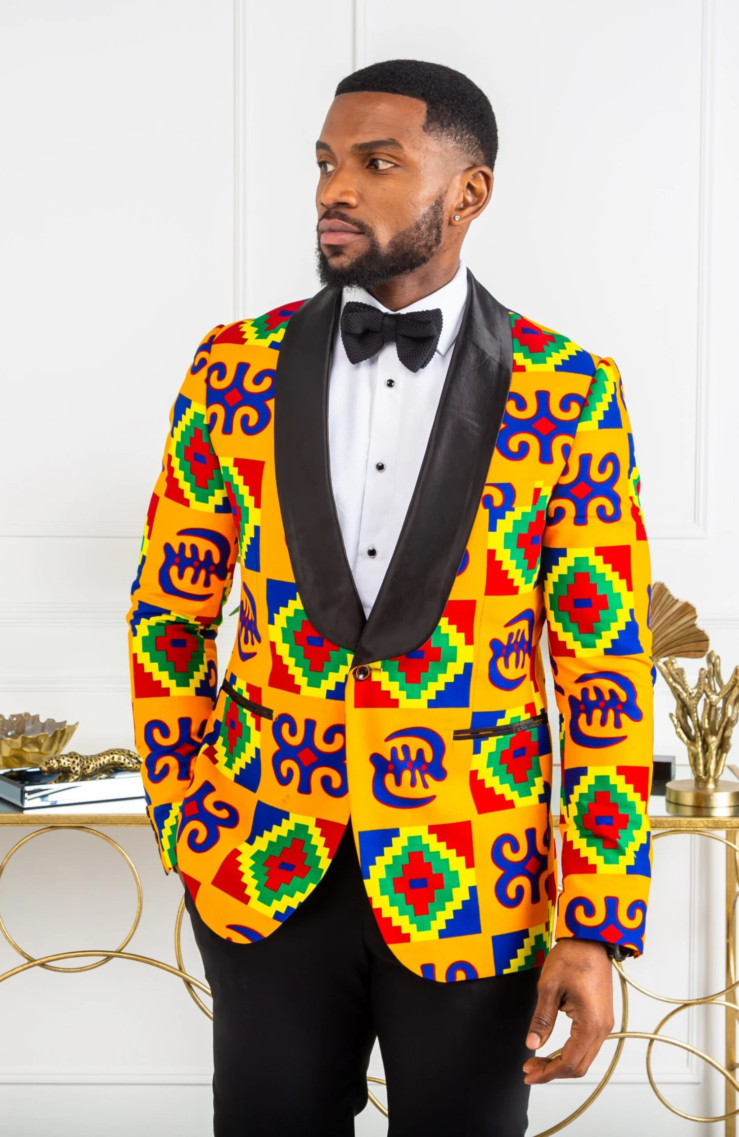 For a classic black-tie look with an edge, swap your shirt for a roll neck and pair your African print jacket with tailored black trousers.