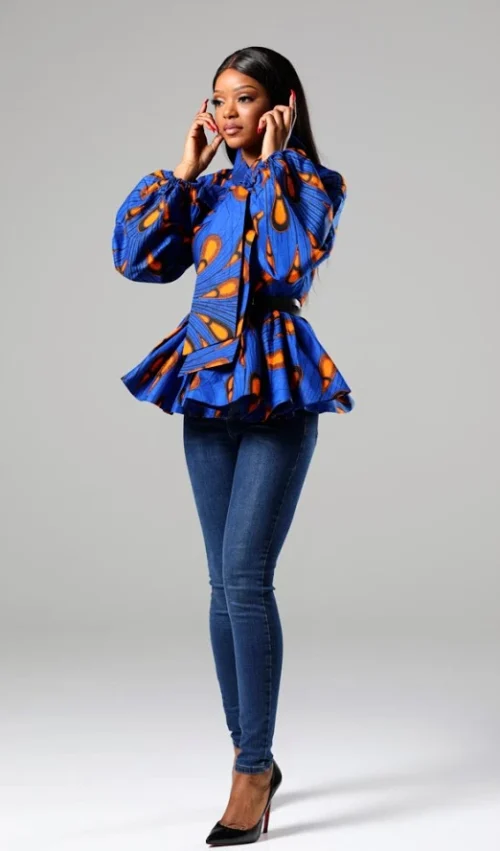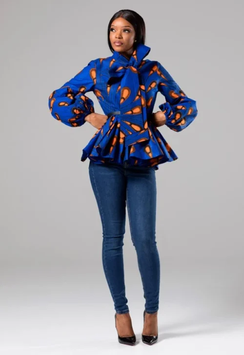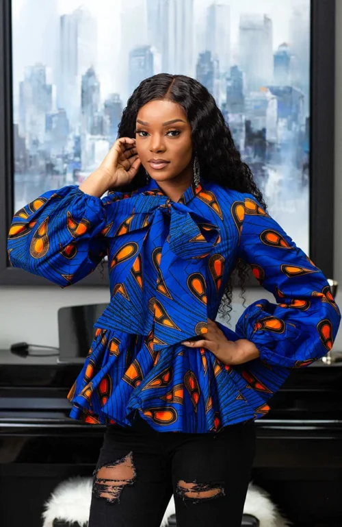 Our African print pussybow peplum blouse is crisply tailored, yet casually chic – our newest must-have. Inspired by the 70’s, our blouse features bell (balloon) sleeves and an ultra feminine neck tie over a frontal zipper.