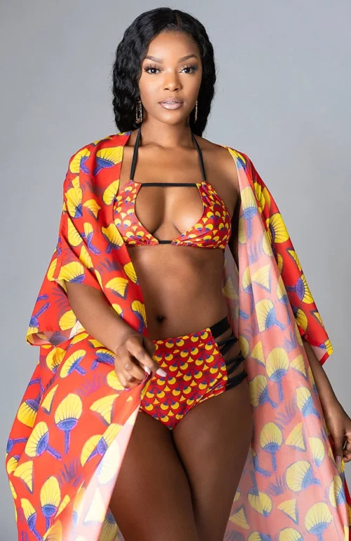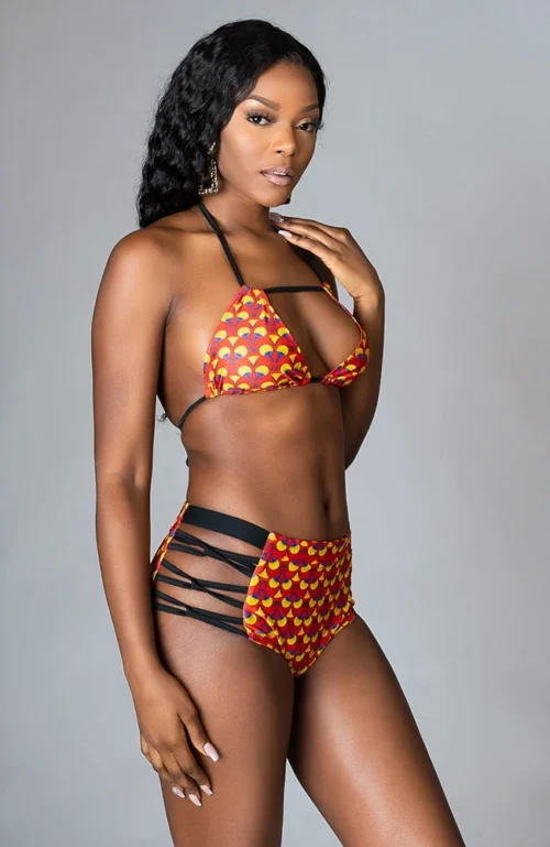 Vibrant colours meet African print swimsuit and this look is oh so perfect for summer. This gorgeously designed Ankara bikini includes lace back top. Super sexy, reminiscent of retro glam, bring glam to the poolside in our beautiful African print bikini swimwear. Team with jeans or skirt to create an instant go to look. Wear with its matching cover up and high heels for poolside glam.