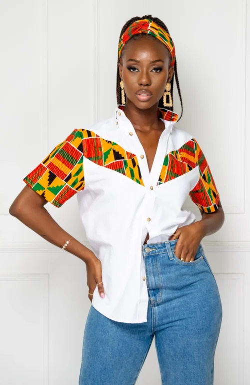 These super jazzy African Print Shirts for Women are made from 100% African wax fabric. It features a vibrant Ankara Floral design and a crisp tailored smart collar. This shirt is best paired with casual contrast shorts, a bucket hat and trainers for a complete colourful festival outfit.