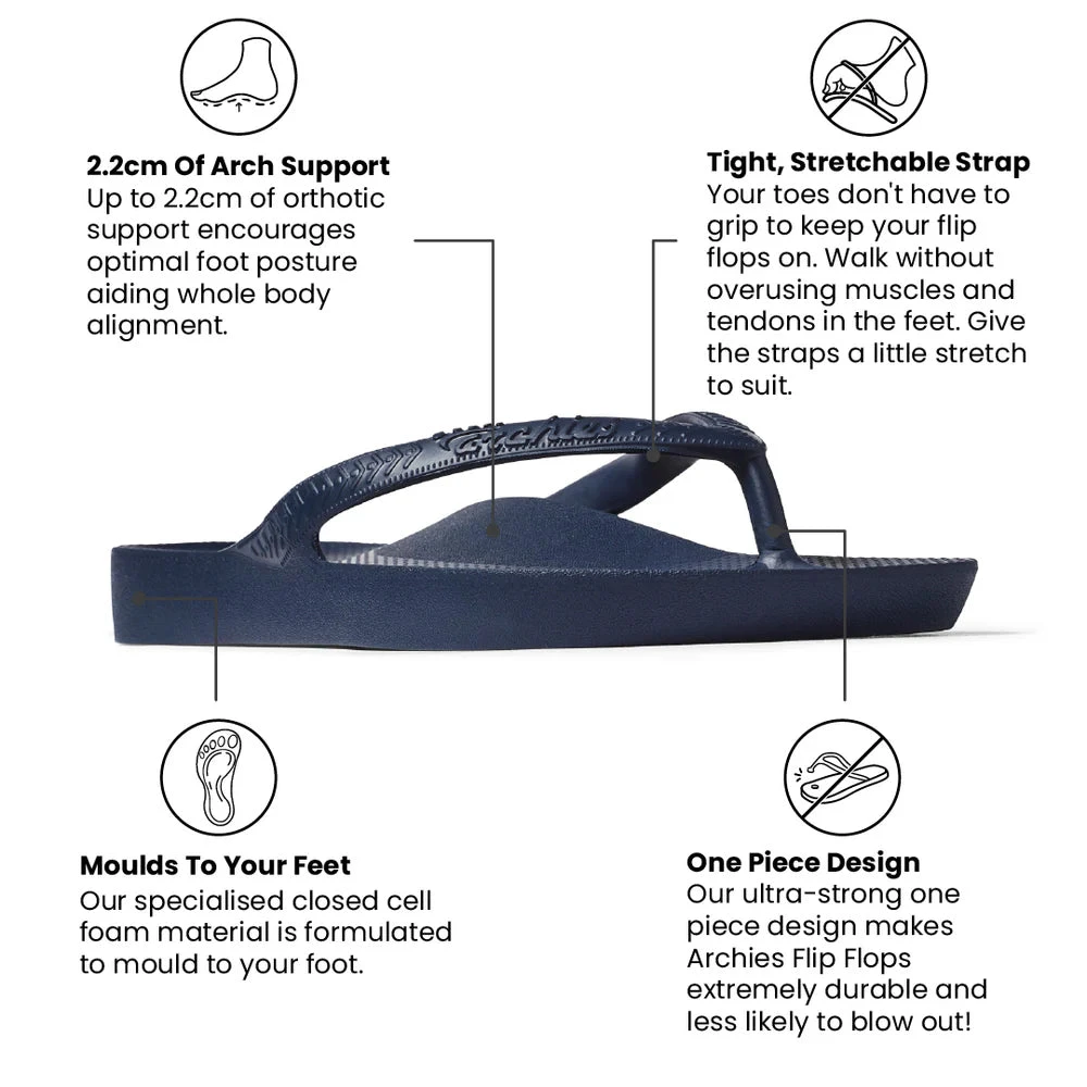 Stop wearing unsupportive flip flops and give your feet some love with the physiotherapist designed Archies Arch Support Flip Flops.
