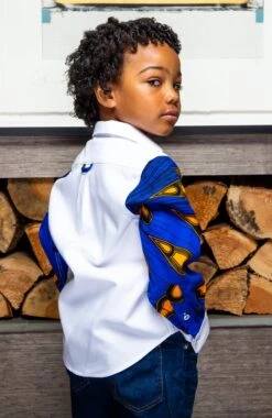 Now your boys can look as stylish as you in our new African Shirts for Boys! Combining African print fabrics and crisp, white cotton, our Tailored Fit White Button Down Oxford Shirt is exactly what you need when you want only the very best for your Boys. Featuring a vibrant Ankara pattern and long sleeves, this Boys African Shirt is perfect for stylish culture representation at every occasion, including weddings, photoshoots and birthdays! There’s never been a better reason to wear matching outfits with your family!