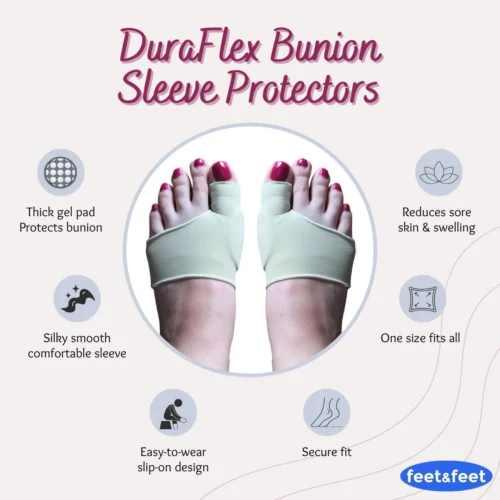 Designed for protecting the bunion from irritation, our DuraFlex Bunion Sleeve Protectors prevents the bunion from rubbing against rough surfaces when wearing any type of footwear. As a result, common bunion symptoms – sore skin, swelling, corns and calluses – are avoided.