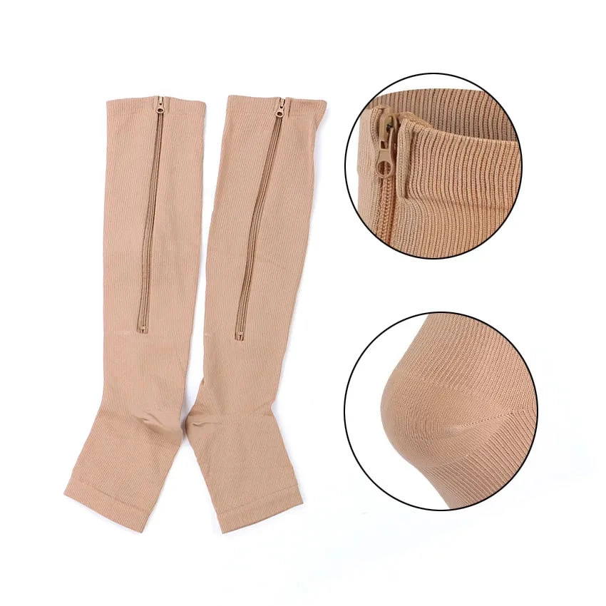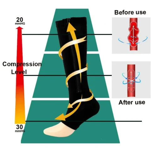 Our FlowRevive Zipper Compression Socks relieves leg aches and pain, and prevent venous disorders – such as edema, deep vein thrombosis (DVT), economy class syndrome (ECS) and phlebitis – which can lead to the formation of blood clots, swelling, and tired and painful legs.