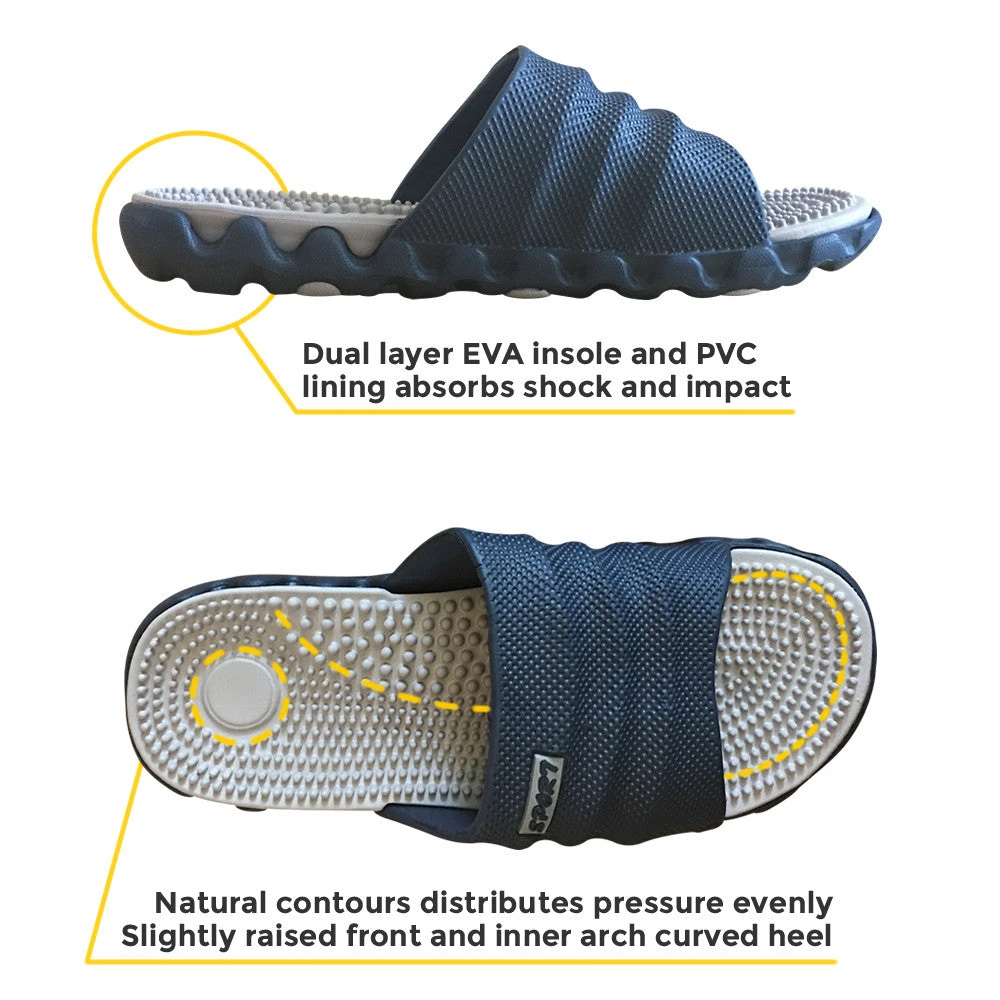 With a dual layered construction that has a comfortable EVA insole with a durable PVC lining, these slippers are designed to absorb shocks and impacts to reduce long term foot problems.