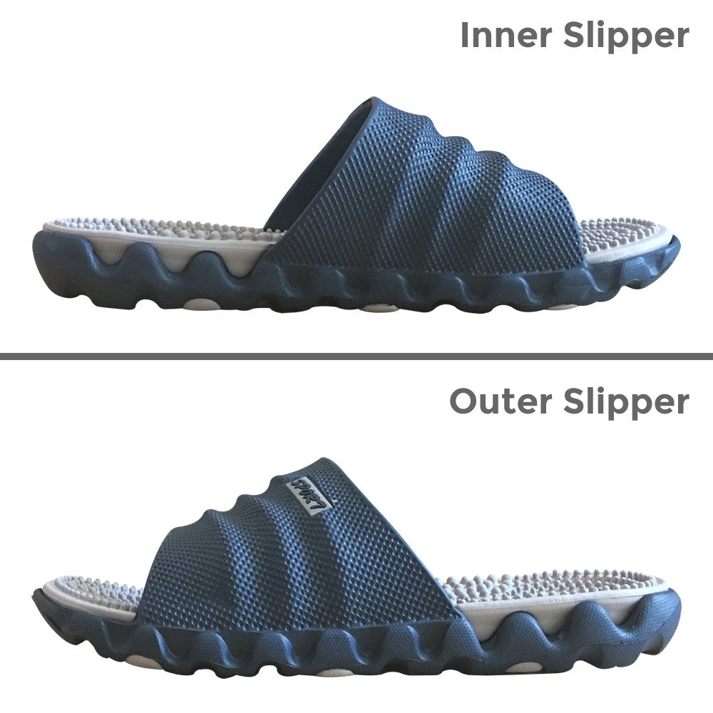 Acting as a remedy for those who suffer from foot aches, cramps and pain from a lifetime of pressure, our FootRevive Dual Layer Sports Massage Slippers are the quintessential on-the-go foot therapy, no matter your age, gender or occupation.