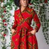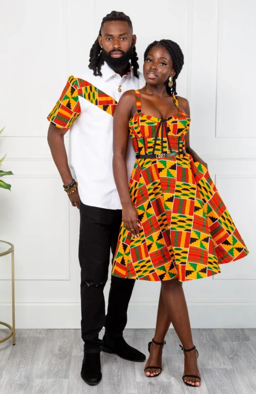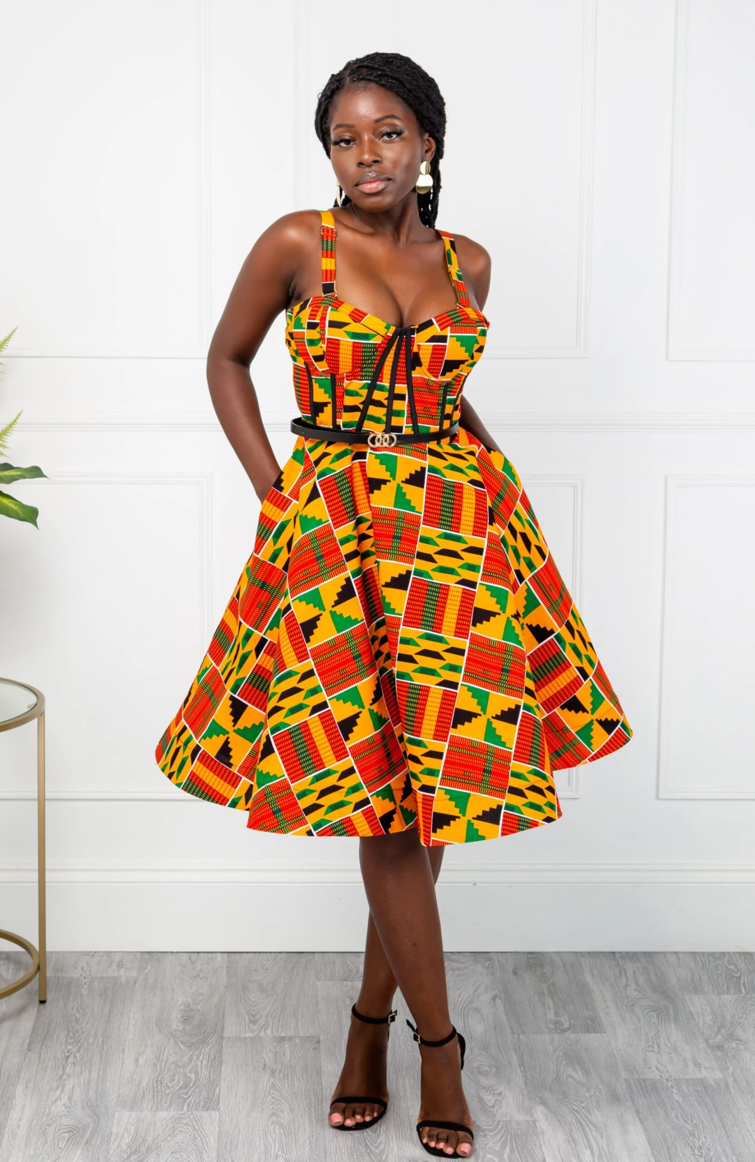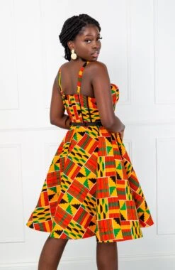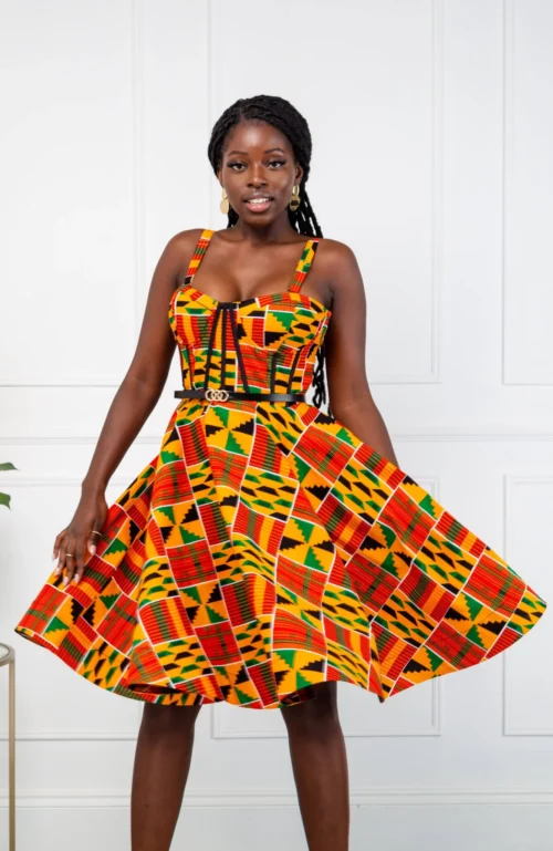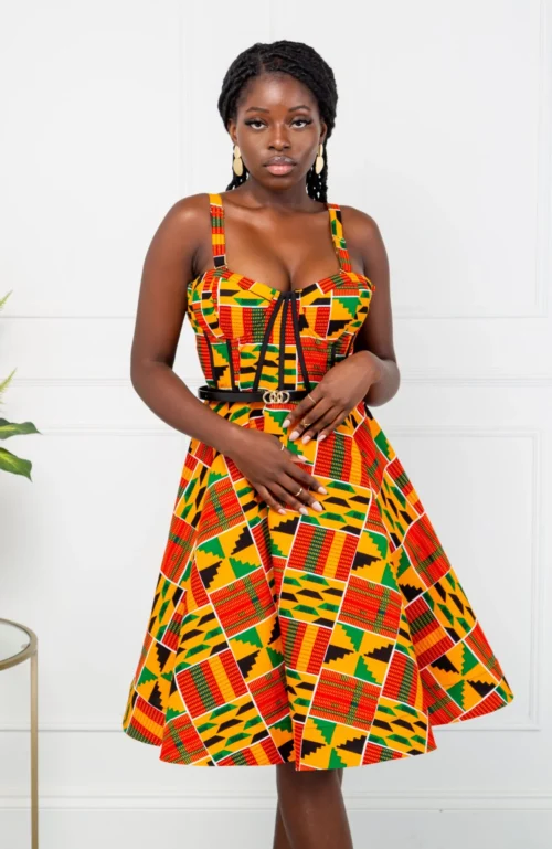 - Corseted bodice knee-length dress in a bold African print fabric