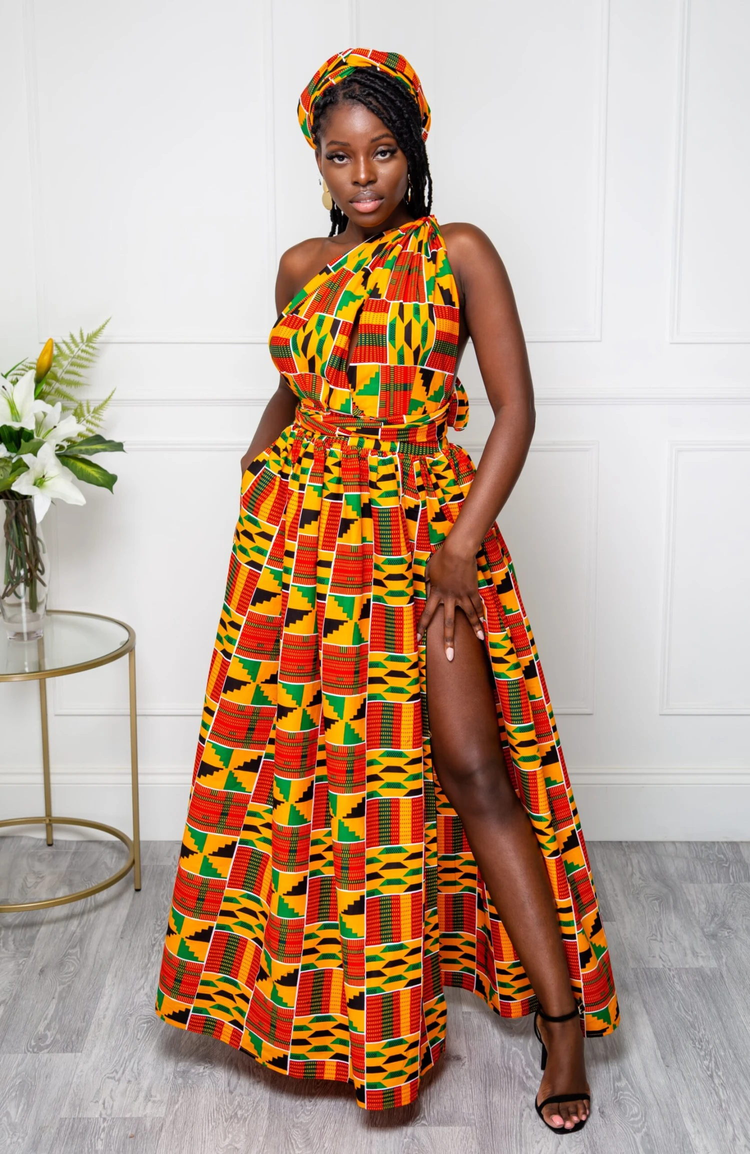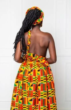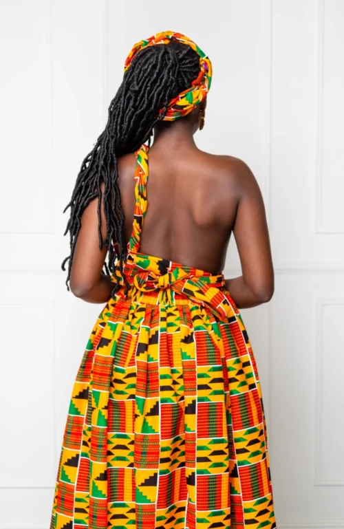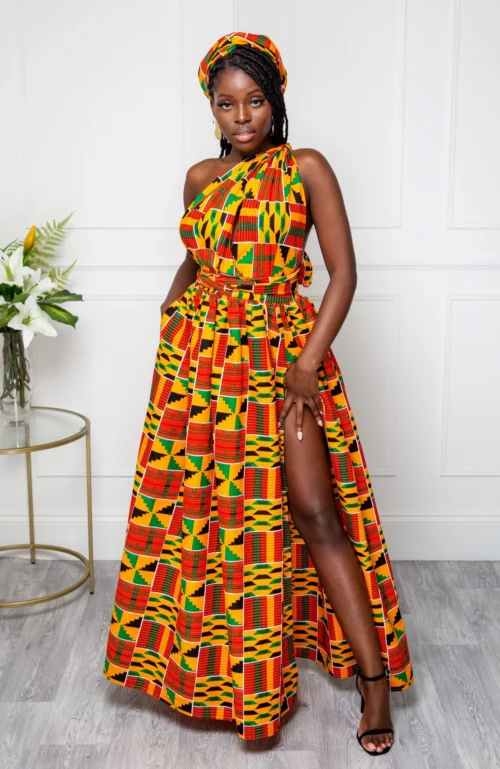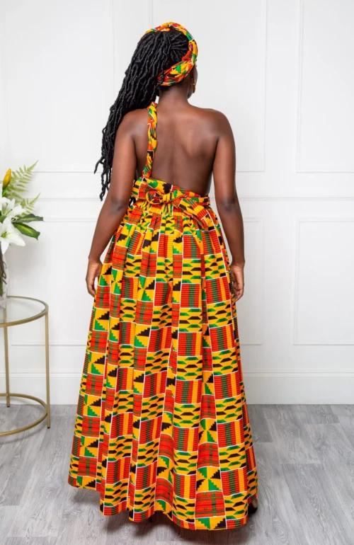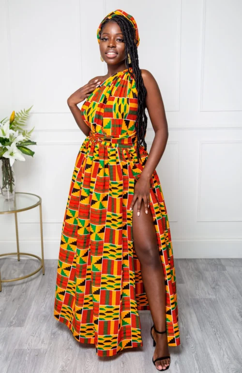 Stunning multiway African print maxi dress. Perfect for (and very popular as) bridesmaid dresses, this one dress can be worn in over 6 different ways! Just wrap the straps around your body in whatever way you desire to create a different dress each time!