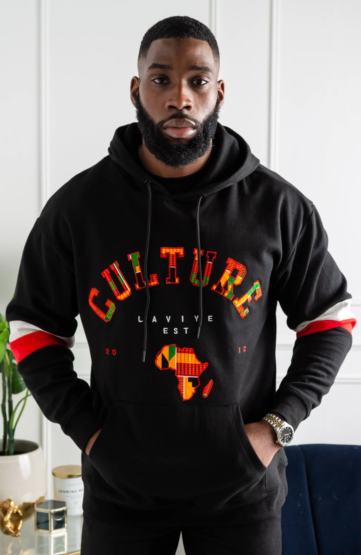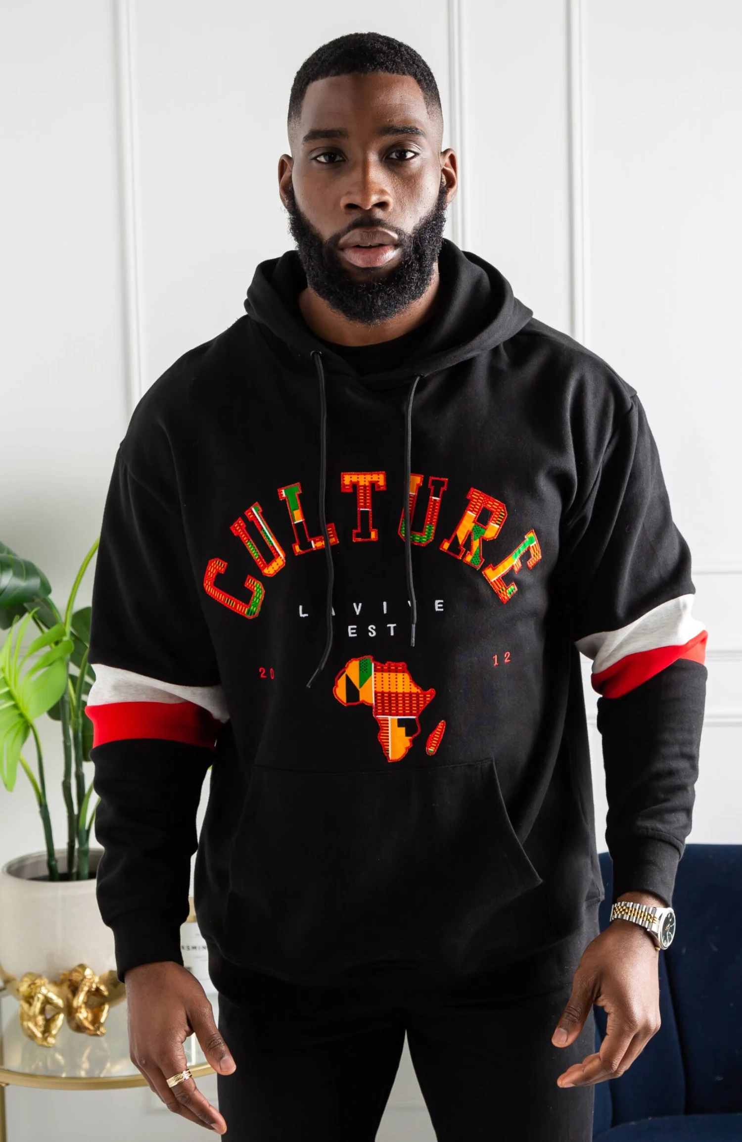 Relax and represent your culture in style with this Luxury Africa Map Hoodie, featuring a drawstring hood, cuffed sleeves, and an elasticated waistband. Our Unisex Ankara Hoodie is the perfect fit for both men and women, whether you’re running errands, playing sports or travelling – you can do anything! Showing our love for Ghana with our Kente pattern Culture Slogan, this Luxury Africa Map Hoodie has two stylish stripes on both sleeves and a large kangaroo pocket on the front. Paired with joggers and sneakers or jeans and boots, our Unisex Ankara Hoodie is as versatile as you are!