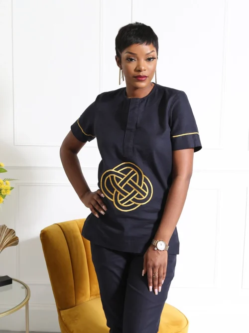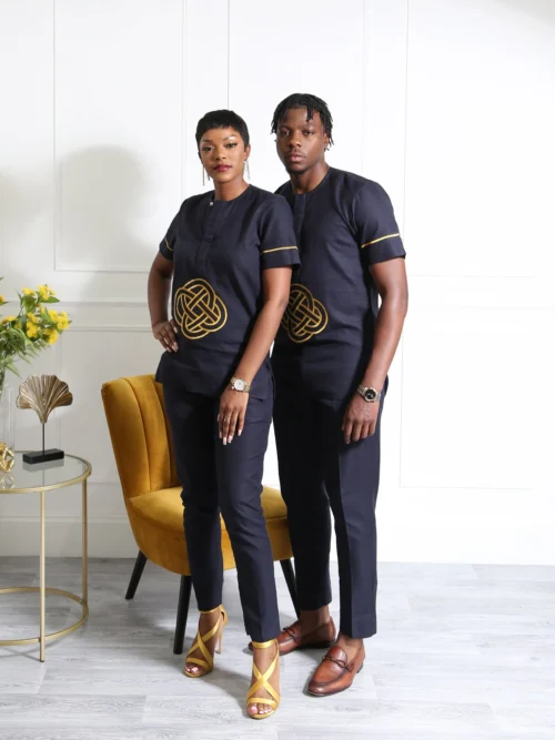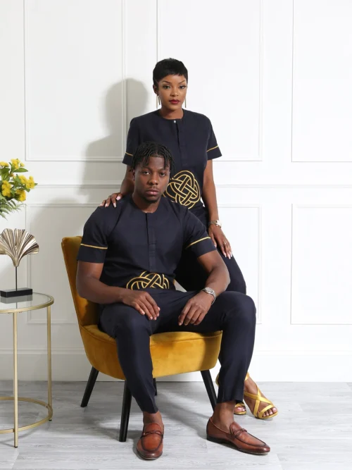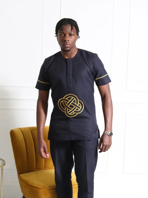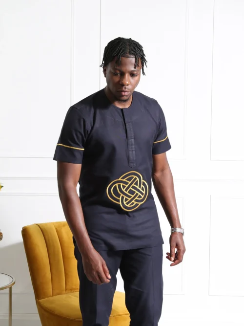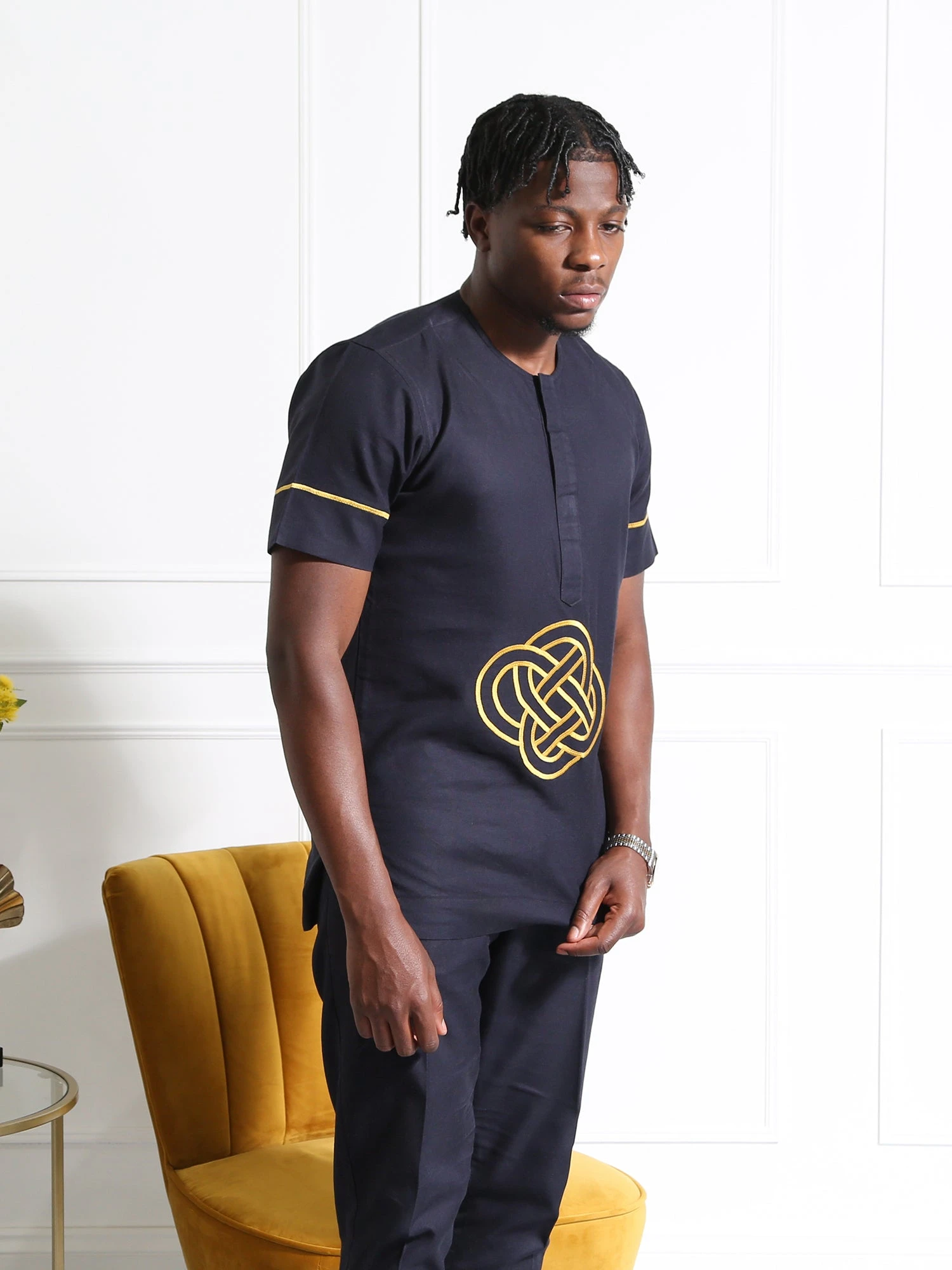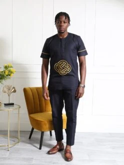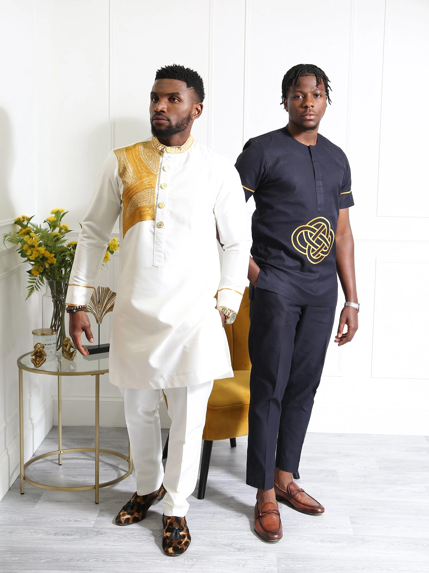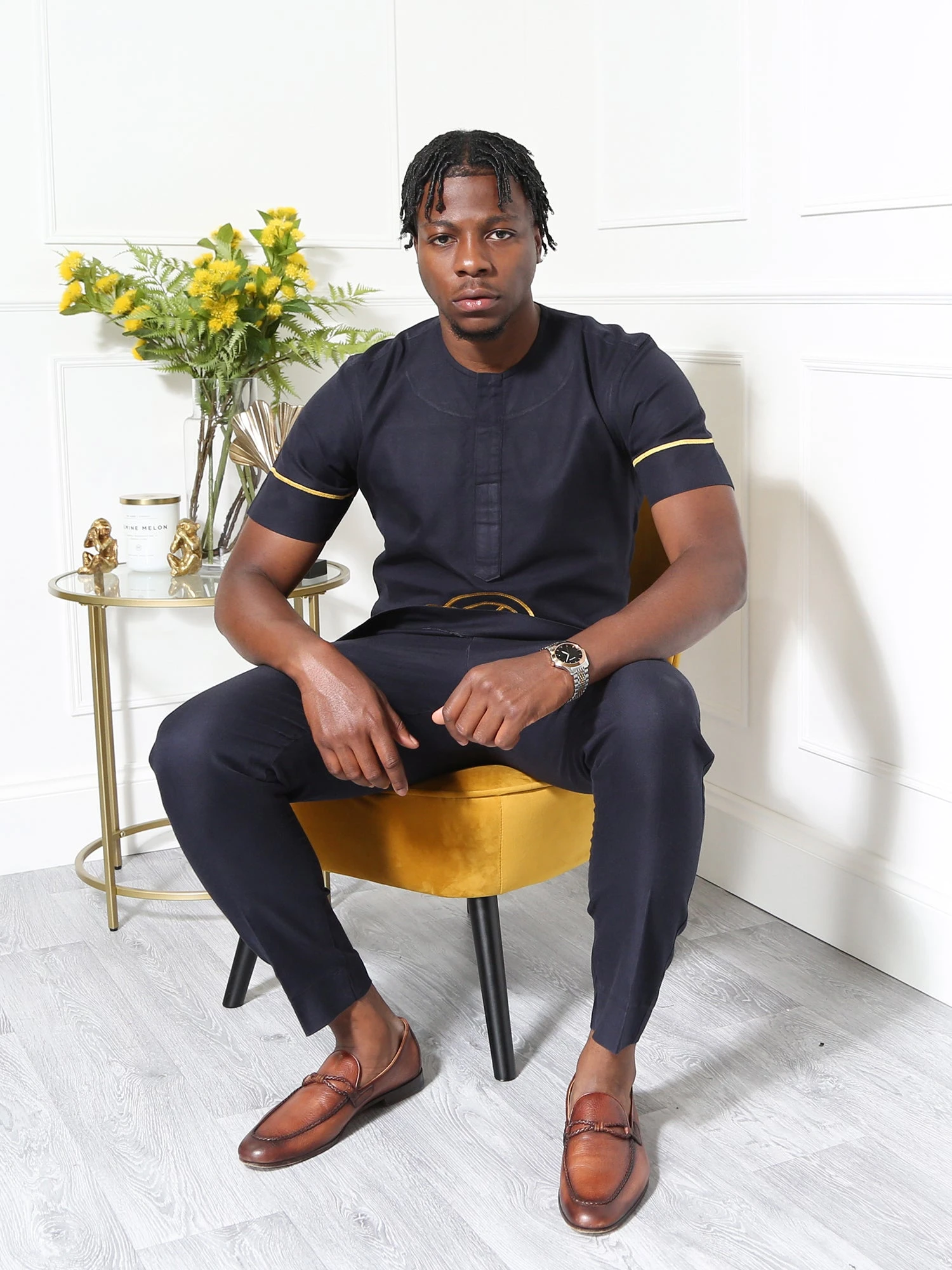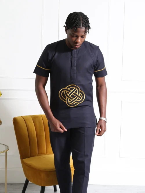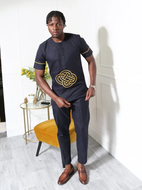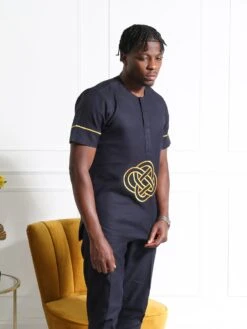 Exude confidence and class with this Navy Blue Embroidered Men’s Two-Piece Set, a stylish blend of tradition and modernity. This outfit features a short-sleeve tunic top with bold golden embroidery at the centre, adding a luxurious and unique touch. The structured slim-fit trousers perfectly complement the top, creating a sleek and polished look for any special occasion.