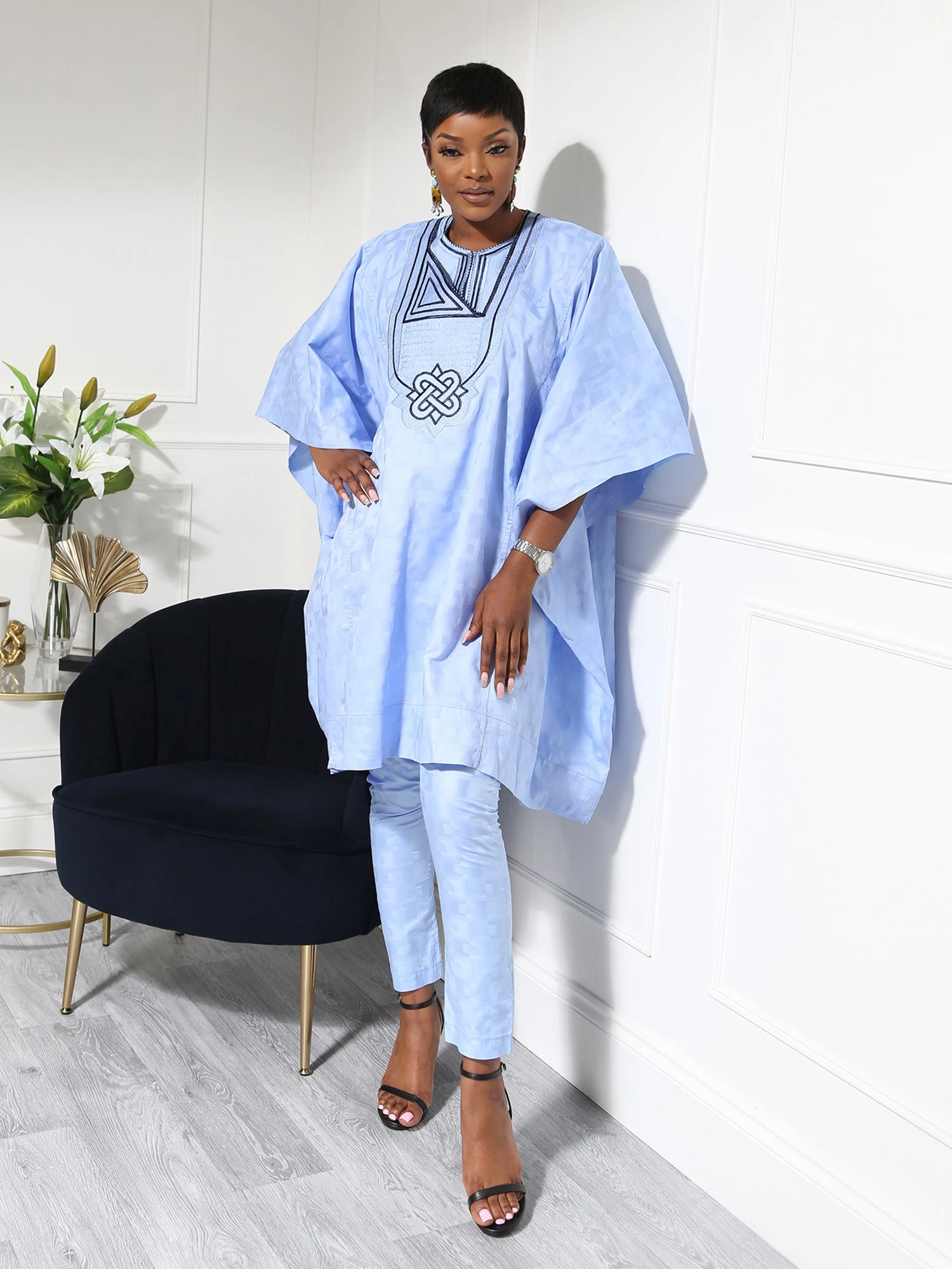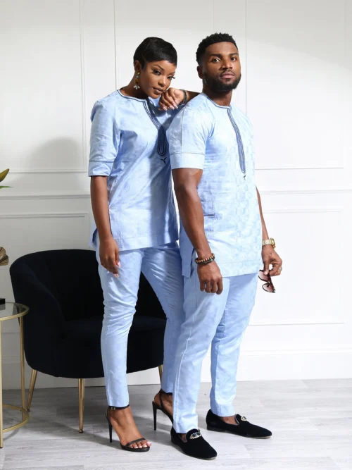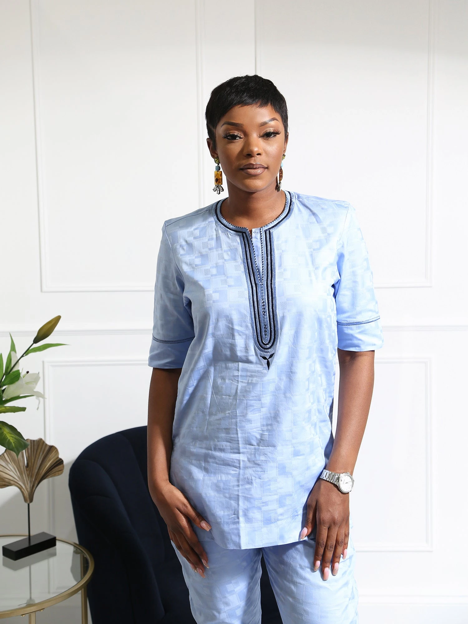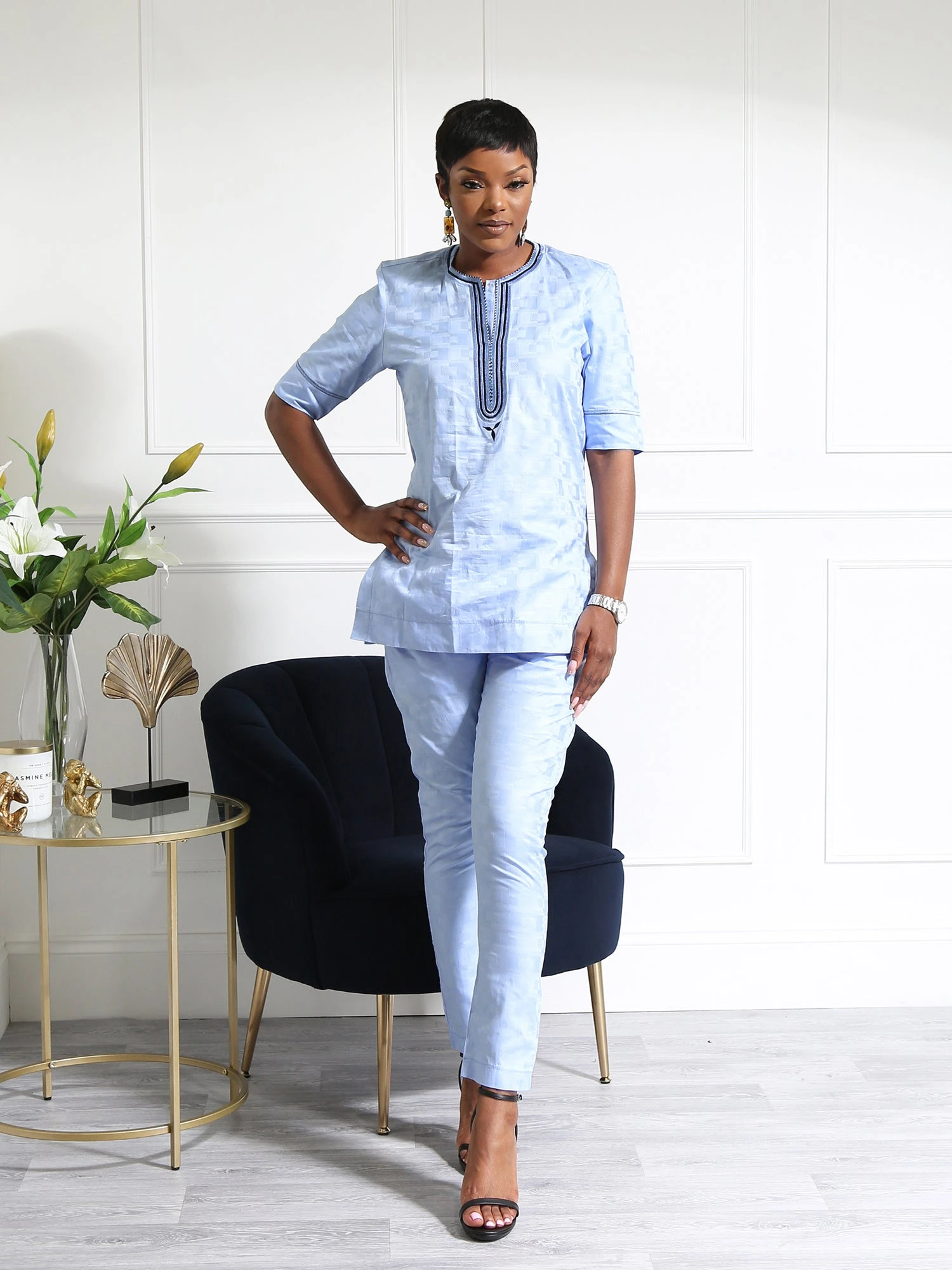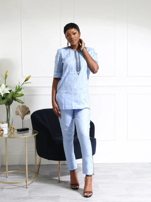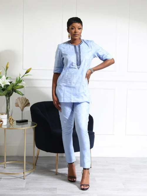 Refined and timeless, this Sky Blue Women’s Two-Piece African Outfit combines modern tailoring with traditional embroidery for a versatile and stylish look. The tunic features intricate embroidery on the neckline, while the slim-fit trousers provide comfort and sophistication. Made from high-quality jacquard fabric with a subtle texture, this outfit is perfect for cultural events, casual celebrations, and formal gatherings alike. Step into effortless elegance and celebrate African heritage with this stunning ensemble.
