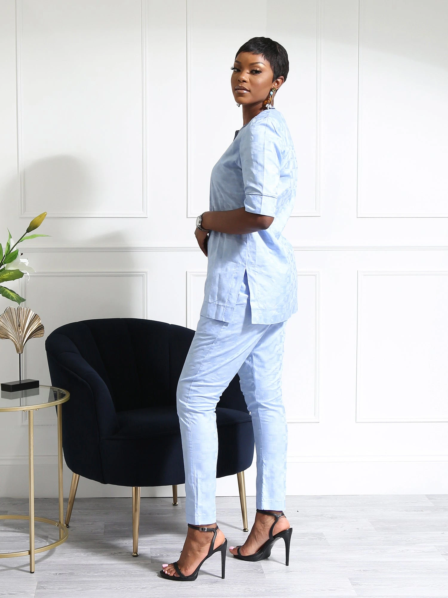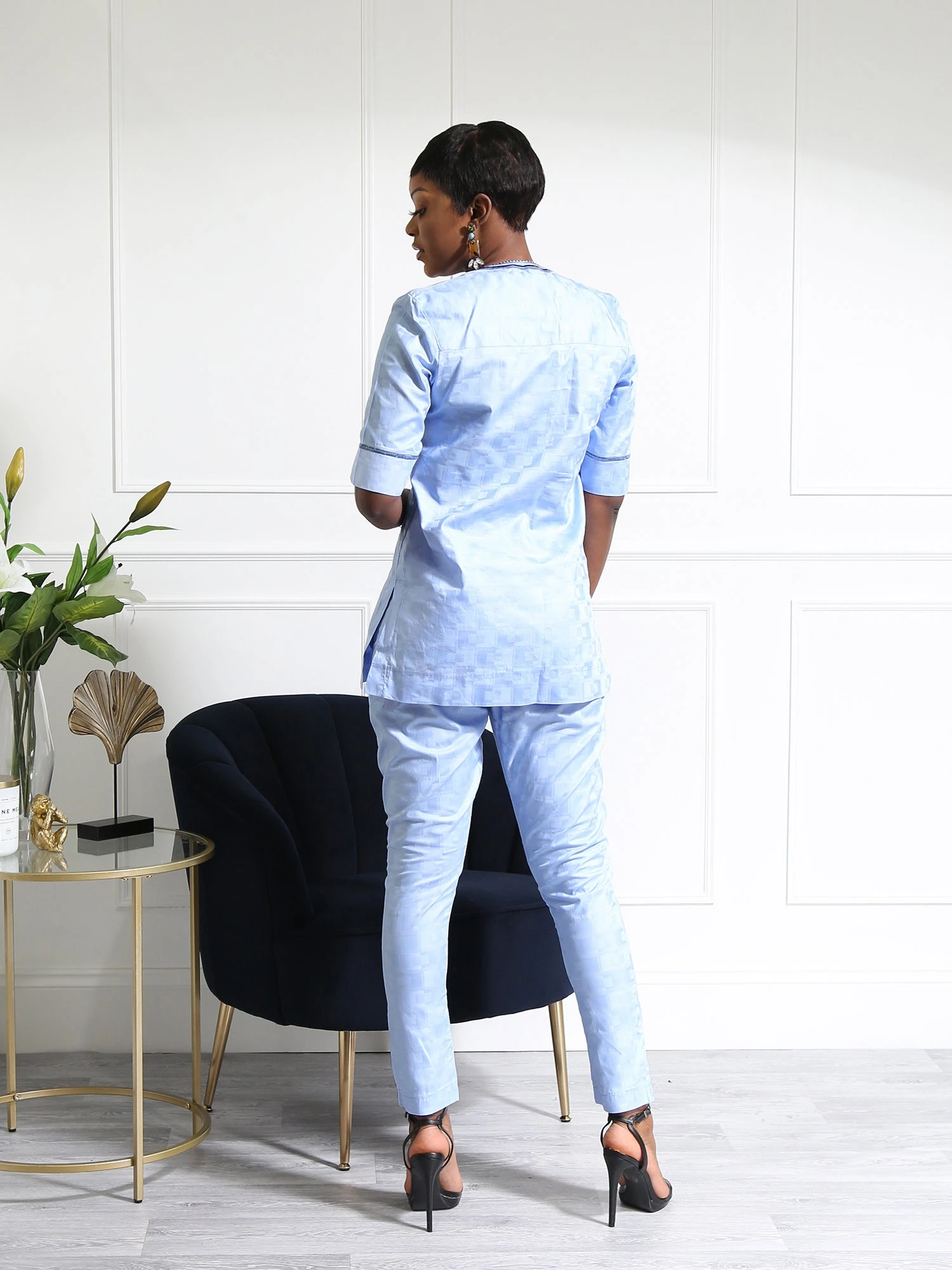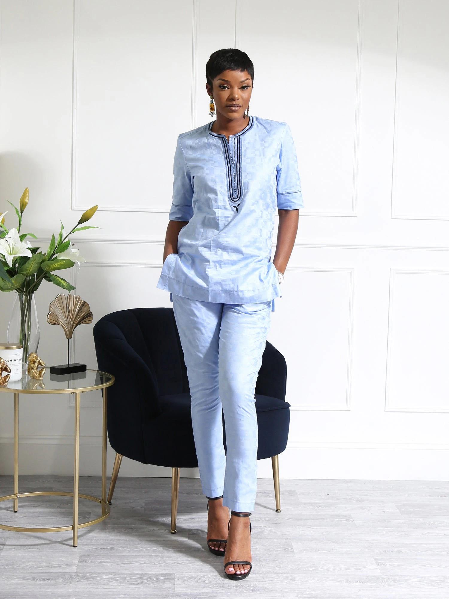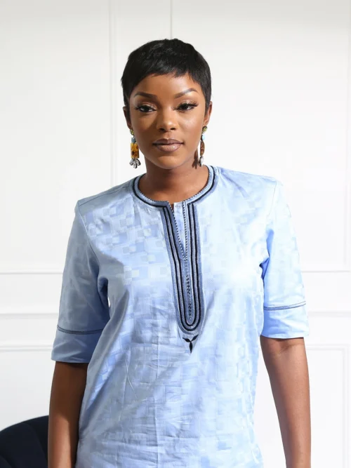 Refined and timeless, this Sky Blue Women’s Two-Piece African Outfit combines modern tailoring with traditional embroidery for a versatile and stylish look. The tunic features intricate embroidery on the neckline, while the slim-fit trousers provide comfort and sophistication. Made from high-quality jacquard fabric with a subtle texture, this outfit is perfect for cultural events, casual celebrations, and formal gatherings alike. Step into effortless elegance and celebrate African heritage with this stunning ensemble.