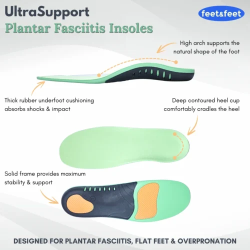 With optimal heel and arch support as well as superb comfort and stability, our UltraSupport Plantar Fasciitis Insoles has been perfected to relieve plantar fasciitis, flat feet and high arches.